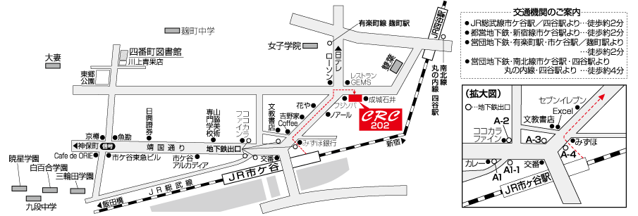 アクセス | JR中央・総武線 市ケ谷駅/四谷駅 徒歩2分 都営地下鉄 新宿線 市ヶ谷駅 徒歩2分 営団地下鉄 有楽町駅・市ヶ谷駅・麹町駅 徒歩2分 営団地下鉄・南北線 市ヶ谷駅・四谷駅 徒歩4分 丸ノ内線 四谷駅 徒歩4分 |
