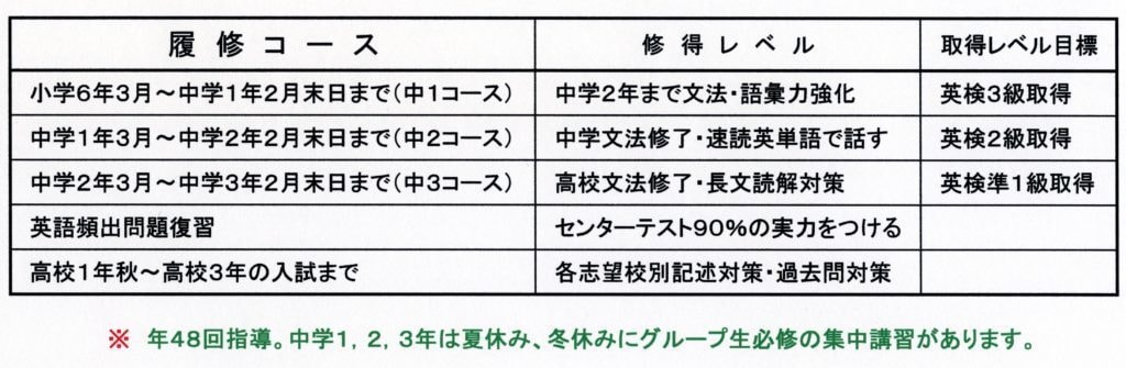 ●2月の体験授業を受講された後、初回までにCRC入会手続きをしていただきます。 教材・問題集が配布され、小学6年生の2月末から本格的なCRCの英語指導が始まります。夏休みには、英文法集中講座があり、中学1年文法を完全に習得させ、ここからは、学校の授業は、CRCの復習となります。学校の定期考査では、満点を目指していきます。中学1年の冬休みには、中学2年の英文法を終了し、読解力・リスニング・ライティング・語彙力もつけて、中1・1月には英検3級に合格させます。